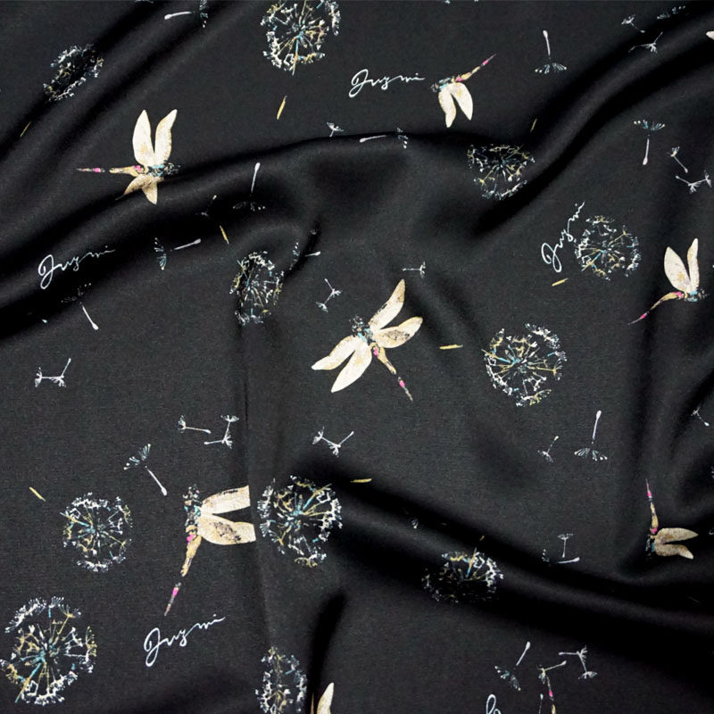 黑底蒲公英蜻蜓大牌数码印花仿真丝力缎醋酸稠面料/防静电布料热门设计联盟服务商
